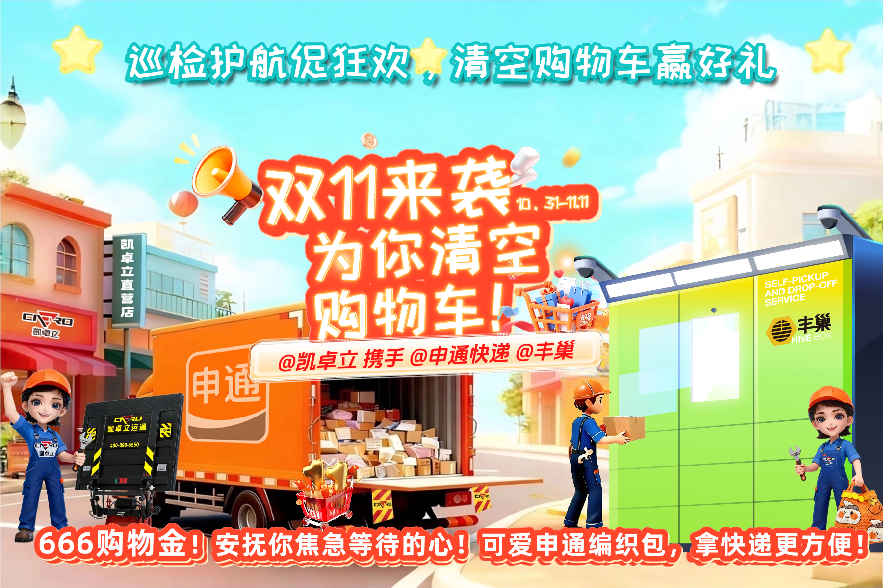 清空購物車迎好禮!凱卓立 × 申通 × 豐巢雙十一巡檢護航,促狂歡。 親愛的 “剁手黨” 們,雙十一的快遞是不是已經(jīng)讓你忍不住刷了八百遍物流信息?別慌!為了讓你順順利利拿到每一個包裹,凱卓立攜手申通快遞、豐巢,開啟雙十一巡檢護航促狂歡活動,從物流運輸?shù)侥┒私桓叮虨槟愕陌?“保駕護航”!